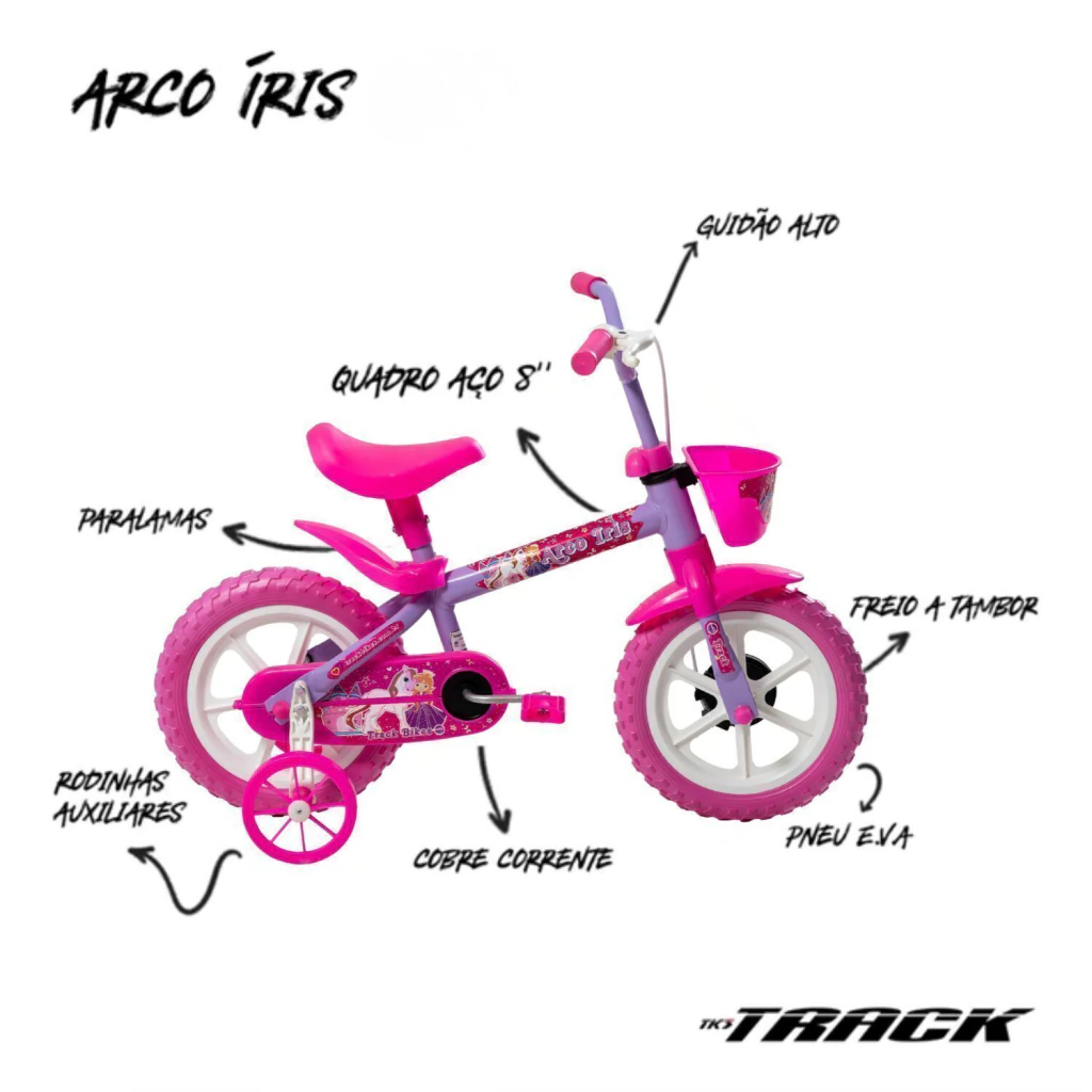 A Bicicleta Aro 12 Infantil Track Arco Íris é uma opção encantadora para os pequenos ciclistas que estão prontos para suas primeiras aventuras sobre duas rodas. Com um vibrante design em Lilás com Rosa, esta bicicleta chama a atenção e inspira a diversão. Equipada com rodinhas laterais para estabilidade extra, a Track Arco Íris oferece um ambiente seguro para que as crianças aprendam a pedalar com confiança.